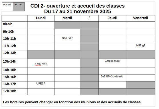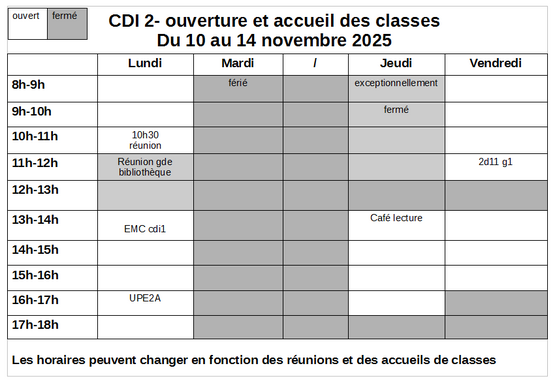 Par KARINE TALABARD, publié le vendredi 14 novembre 2025 14:53 - Mis à jour le vendredi 14 novembre 2025 15:00Le CDI 1 est temporairement fermé. Les horaires du CDI 2 peuvent changer en fonction des réunions et des accueils de classes. Consulter le planning hebdomadaire. -