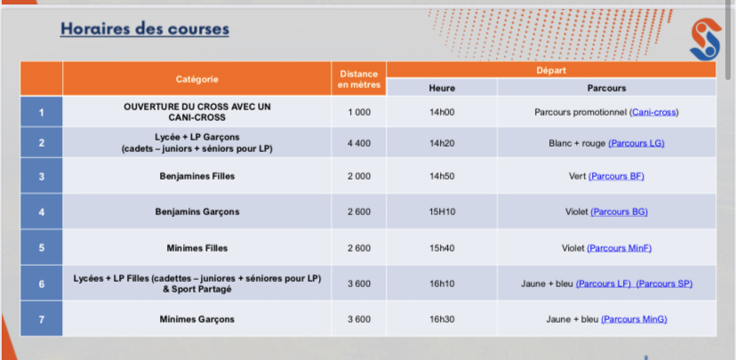 - CROSS DÉPARTEMENTAL : déplacement encadré par M.MONTAGNE et Mme AUBRY au Lycée de MARMILHAT de LEMPDES. Départ à 12h30 devant l'accueil du lycée et retour vers 17h00 . En PJ la liste des participants.